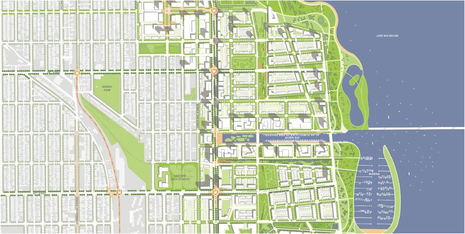 Originally the site of U.S. Steel’s South Works mill, Lakeside’s brownfield industrial past is slowly transitioning from steel mill to innovative mill. The nearly 700-acre parcel of land is bounded by 79th Street on the north and the Calumet River of the south. It extends to Burley Street and Green Bay Avenue on the west, and Lake Michigan on the east. As a peninsula that extends into the lake, the site is larger than Chicago’s Loop business district.